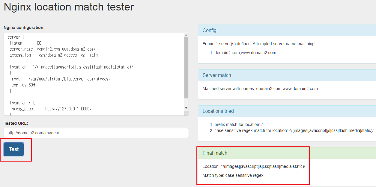 링크를 들어가시면 샘플로 작성된 설정파일과 테스트 url이 보입니다. 하단의 Test 버튼을 클릭하면 테스트 url이 어떤 설정에 매칭되는지 보여줍니다. 샘플의 경우 두개의 location 이 설정되어있고 테스트 url은 그중 하나에 매치가 되는것을 보여줍니다. Test 버튼을 클릭하지 않고 테스트 URL입력후 엔터키를 치셔도 됩니다.