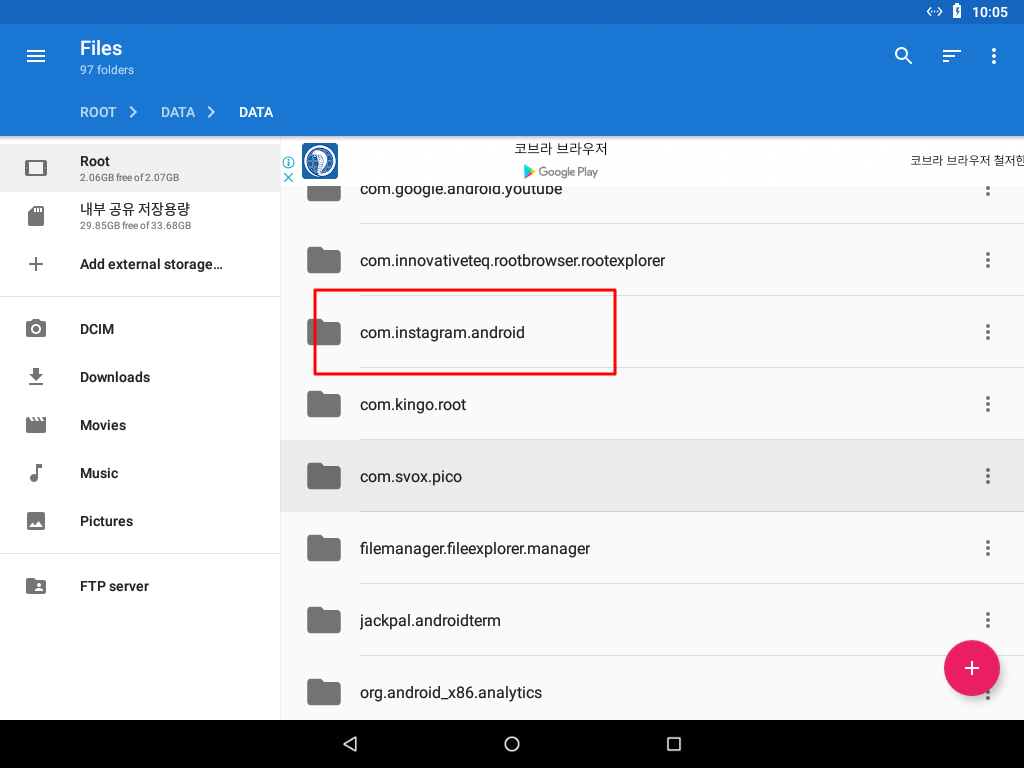 아래 이미지는 루팅 후에 Root Explorer를 이용하여 Root 디렉토리를 탐색하는 모습입니다. ‘ROOT > DATA > DATA’ 로 이동하니 인스타그램이 설치된 디렉토리 com.instagram.android 가 보이네요. 저 디렉토리를 내부 디렉토리로 복사하겠습니다.