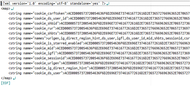 파일 이름도 그렇지만 xml 안에 있는 속성 이름들에 cookie_ 가 붙어 있는것이 제대로 찾은것 같습니다! 그런데 값들이 ‘ACDE0005~’ 형태로 있습니다. 암호화 또는 인코딩이 된것 같은데 저것을 풀지 못하면 의미가 없습니다.