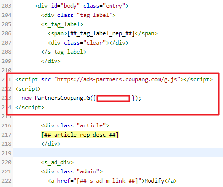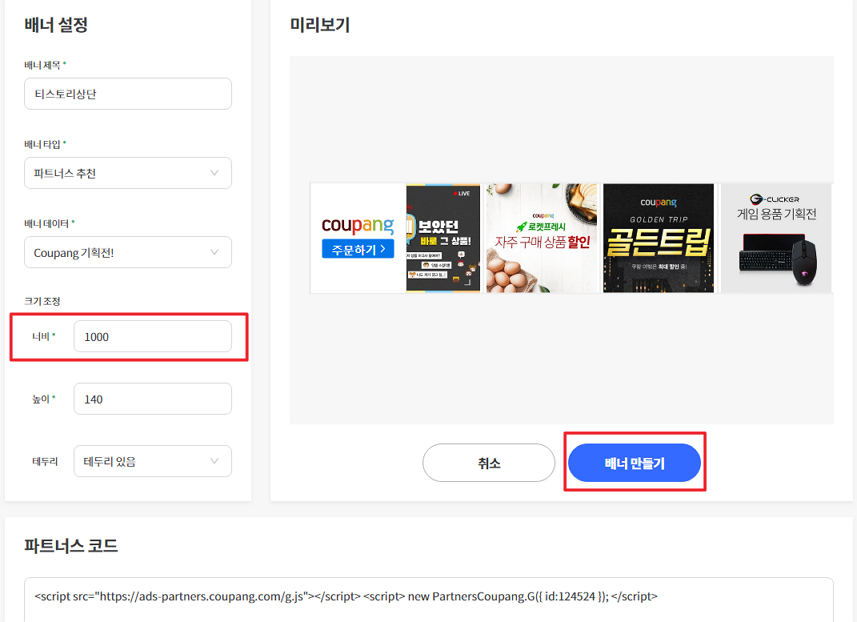 모든 값을 입력하고 배너만들기를 클릭하면 파트너스 코드가 생깁니다. 만들어진 스크립트 코드를 복사합니다. 이 코드를 스킨 편집화면에서 HTML에 추가하면 됩니다.
