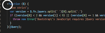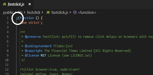 즉 앞에 세미콜론을 붙이는 이유는 이전 소스에서 세미콜론이 누락되어 발생할 수 있는 오류를 없애기 위한 것입니다.