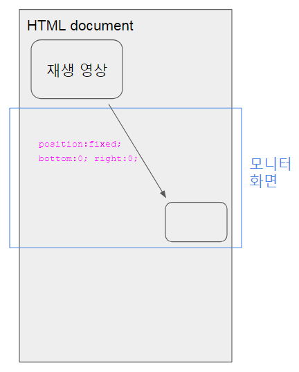 가장 생각하기 쉬운 방법은 스크롤이 발생해서 영상이 가려졌을때 영상 위치의 속성을 변경하여 화면 하단 같은 곳으로 고정하는 것입니다.