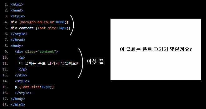 <html><head><style>div {background-color:#880;}div.content {font-size:14px;}</style></head><body><div class="content"><p>이 글씨는 폰트 크기가 몇일까요?</p></div><style>p {font-size:12px;}</style></body></html>