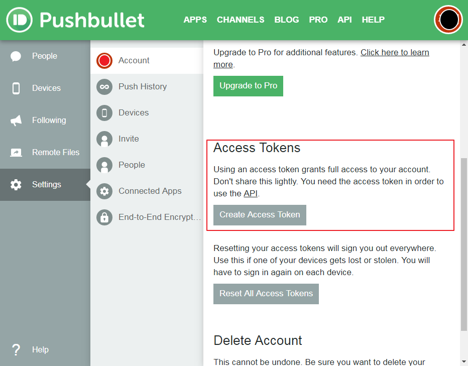 액세스 토큰 설정 : https://www.pushbullet.com/#settings/account