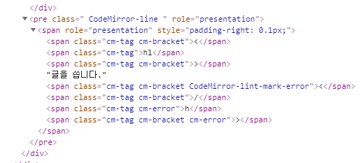위 이미지는 티스토리 블로그 게시물을 작성하는 에디터에 ‘글을 씁니다.’ 를 입력하고 개발자 도구로 확인을 한 것입니다.