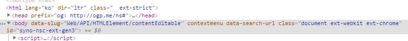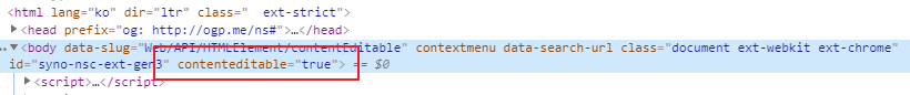중요한 것은 <body> 태그에 ‘contenteditable’ 속성을 사용했다는 것입니다. HTMLElement 요소에 적용할수 있는 ‘contenteditable’ 속성은 값이 ‘true’일 경우 화면에서 직접 요소를 수정할수 있게 됩니다.